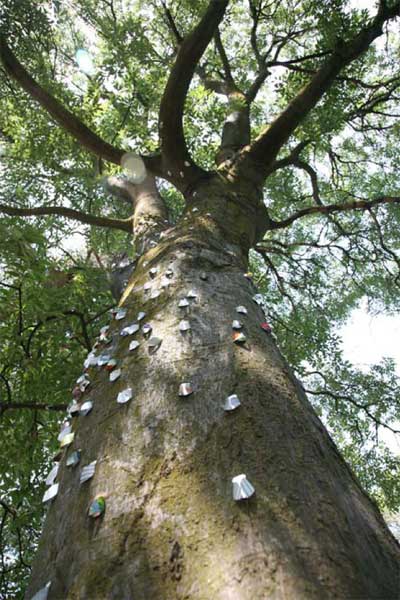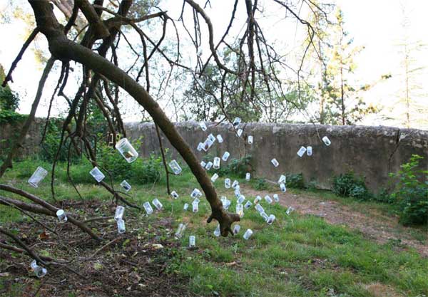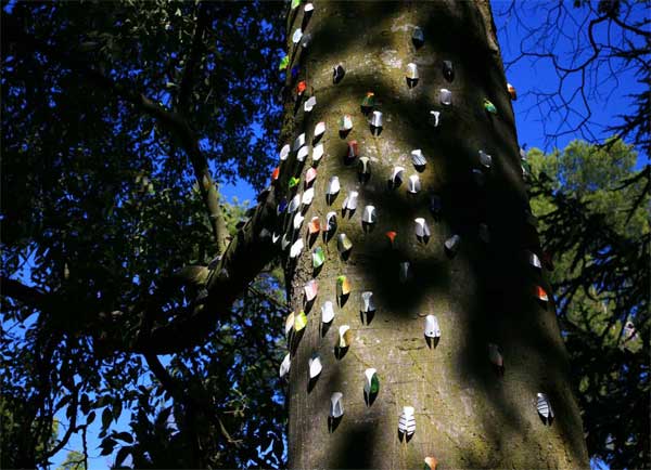 Dispersion de cigales, au château de Lauris sur le tronc des arbres et autres supports, métal, 66 x 32 x 20 mm