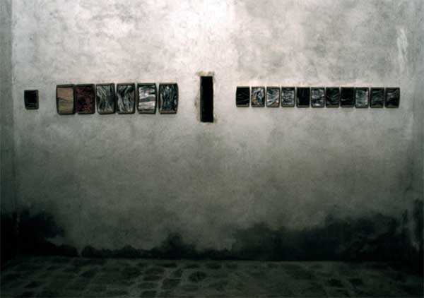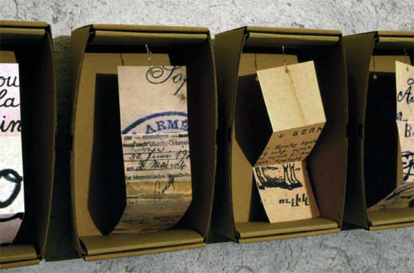 L’accumulation des boites est dans cette installation un jeu et non une obsession. Une accumulation de boites à mots, de textes inaccessibles, de mots furtifs…