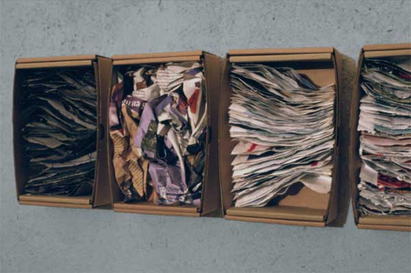 Détail espace 1, boites en carton et papiers pliés et froissés