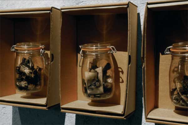 Détail espace 2, boites en carton avec bocaux et papiers brûlés