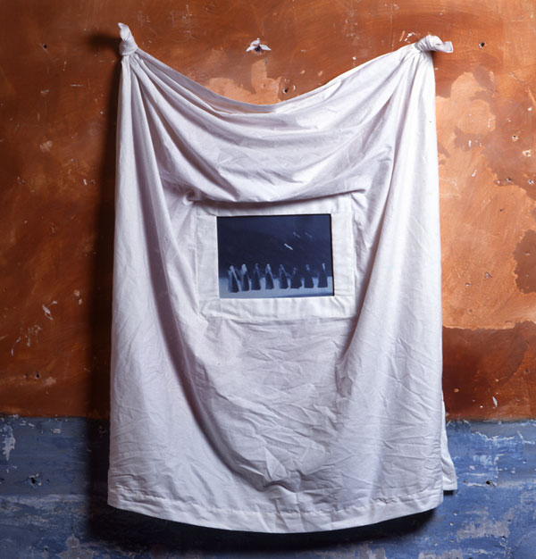 Cyanotype, tissu, vitre, 100 x 70 cm