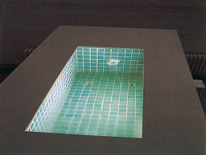 Maquettes d’espace carrelé dans lequel se déverse un jet ininterrompu d’urine humaine synthétique, reconstituée avec tous ses composants. L’espace fonctionne en boucle, l’urinoir urine.