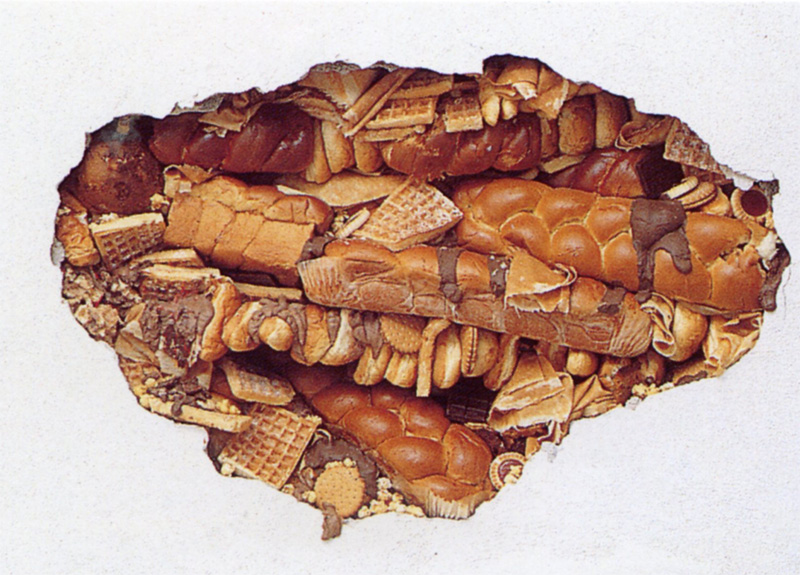 Un trou dans une cloison laisse apparaître un second mur fait de brioches. L’espace se consomme, l’architecture se mange de l’intérieur.