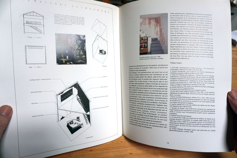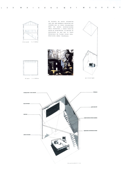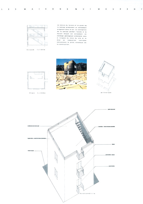 Série de huit projets d’habitation ayant la particularité de s’autodétruire en fonction de phénomènes spécifiques. Élaborés avec l’aide du cabinet Rudy Ricciotti, plans, coupes et axonométries intègrent des données techniques propres à la réalisation des ouvrages. Ces données sont calculées en fonction de la durée de vie d’un individu.