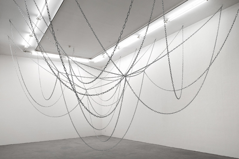 L’entrelacement de chaînes au centre de l’installation reprend les méthodes de l’architecte catalan Antonio Gaudí pour la Sagrada Família à Barcelone: afin de calculer la dimension des arcs et l’inflexion des voûtes de la basilique, ce dernier construisit de gigantesques maquettes de cordelettes suspendues et lestées en différents endroits de petits sacs de sable. |