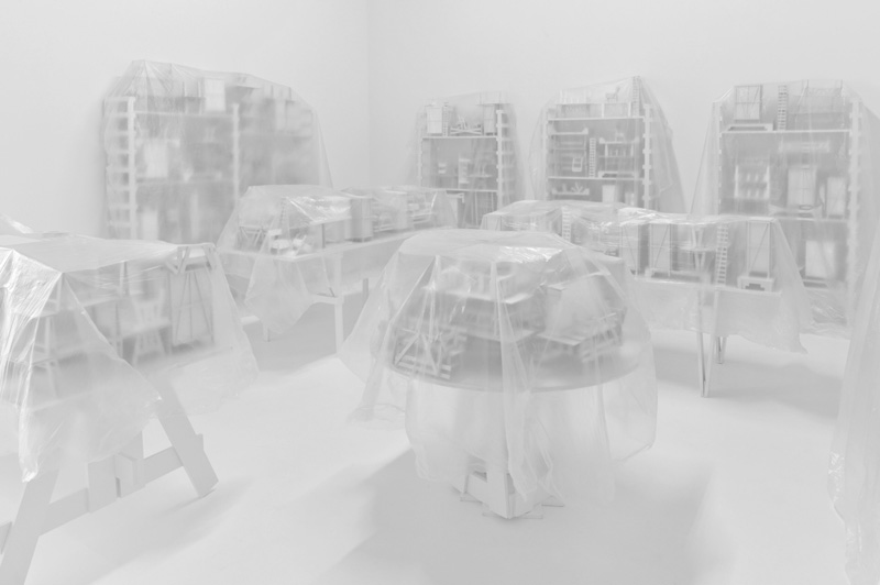 Utopia bianca se compose d’un ensemble de tables et d’étagères sur lesquelles s’empilent des maquettes. L’œuvre prolonge et réactive un projet d’Enzo Mari, Autoprogettazione, en 1974. Le designer italien proposait des plans et schémas de meubles (tables, chaises, lits et autres) à monter soi-même, à moindre coût et avec une grande liberté d’adaptation dans la forme comme dans les couleurs. Les maquettes reprennent le mobilier d’Enzo Mari dans une quantité qui correspond aux besoins de 400 familles, soit la population d’un phalanstère selon la définition de Charles Fourier. De manière objective et clinique, Utopia bianca présente ainsi une communauté potentielle, le projet fantôme d’une utopie encore à construire. |