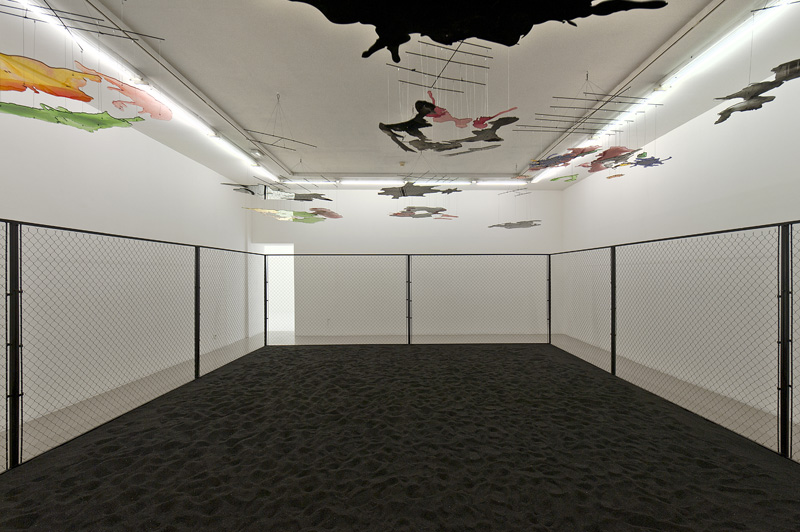 Plexiglas, grillage, néons, bois, métal, 205 × 650 × 792 cm