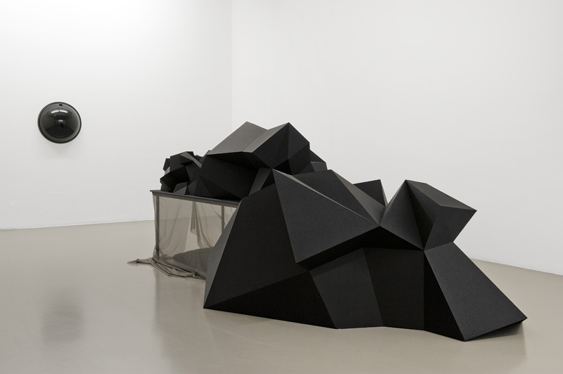 Disparaître ici est une prolongation de Dreamland : une maquette de cette architecture-paysage vient déborder de son socle et se répandre sur le sol. Elle fait alors office de carapace sous laquelle le visiteur peut venir s’isoler et se protéger de toutes les ondes électromagnétiques. |