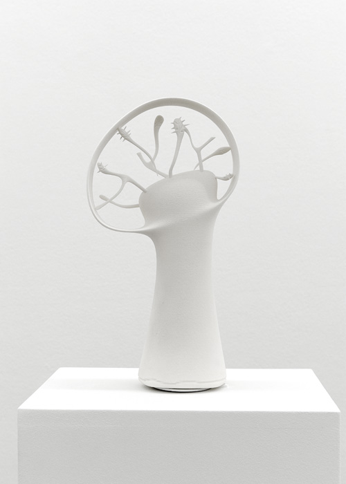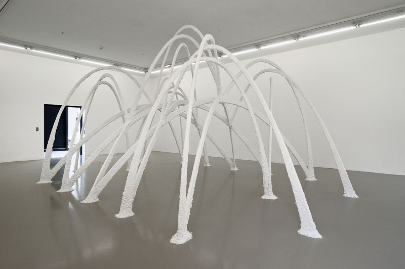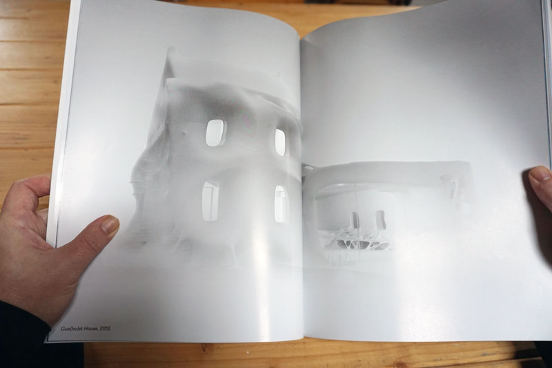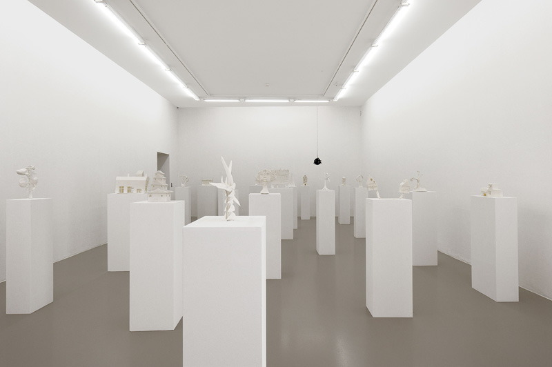 Les «sculptures» de résine ainsi produites, d’un blanc immaculé, prennent des aspects anthropomorphiques (toits troués, formes molles, façades dont s’échappent les branches...) et forment autant de fantômes, de rêves ou de cauchemars d’architecture psychotique. |