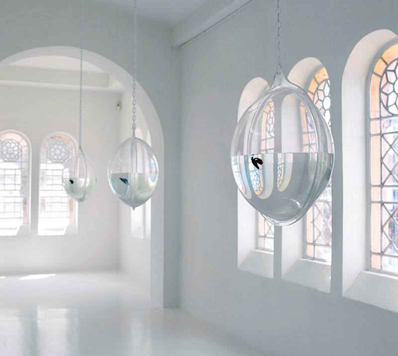 Bois, ouate, 4 plateformes, 180 × 220 cm, trois aquariums en plexiglas, Ø 55 cm, poissons combattants, dispositif sonore, éléments disponibles sur les plateformes: boules Quies©, pommade et patchs anesthésiants décontractants, masque pour les yeux