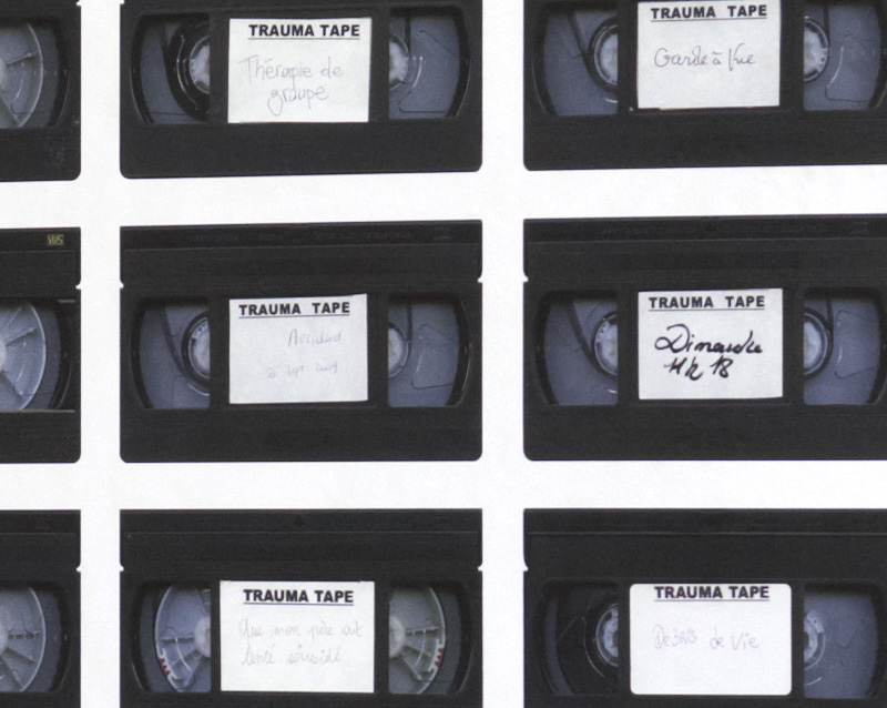 Dispositif d’enregistrement et de stockage des traumas par l’intermédiaire de cassettes vidéo. Ce dispositif propose au spectateur d’expérimenter une technique d’autohypnose consistant à enregistrer mentalement le récit d’un traumatisme afin d’en atténuer la charge affective. La Traumathèque inverse les phénomènes de transfert, comme s’il y avait un retournement des pouvoirs: ce ne sont plus les films qui influent sur notre psyché, ce sont nos psychés qui génèrent les films.