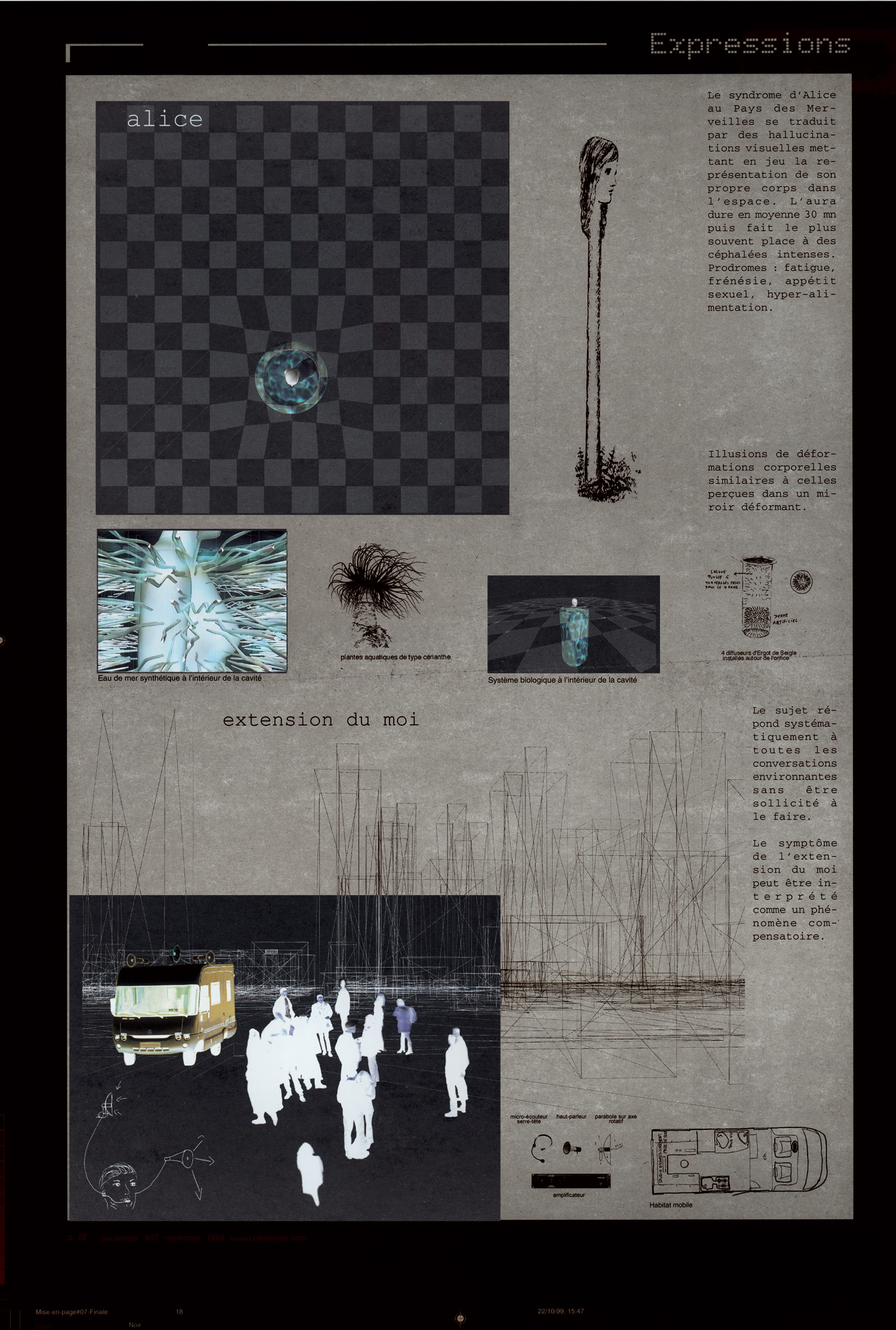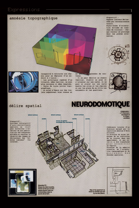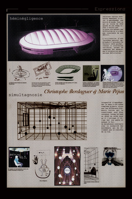 Projets architecturaux élaborés à partir de données fournies par le neurologue Jean-François Chermann sur six pathologies cérébrales entraînant des modifications de la perception spatiale: héminégligence, simultagnosie, extension du moi, délire spatial, Alice aux pays des merveilles, amnésie topographique.