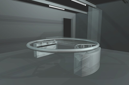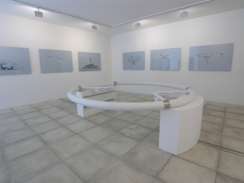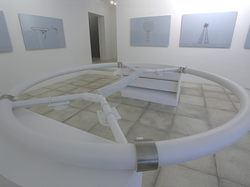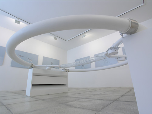 Suivant le même principe que les oeuvres Sonotubes et Hyperprisme, Loop s’appuie sur des règles acoustiques particulières. Ce dispositif sonore affirme à son tour une relation directe avec l’espace d’exposition. Il met en avant un processus de diffusion des ondes sur un mode circulaire puisque les vagues de résonnances produites par le système de vibrations basses fréquences se répercutent le long d’un imposant anneau métallique. Au centre du cercle, un ressort en tension transmet des échos dans toute la structure. Ici, les ondes ne sont pas émises uniquement par des haut-parleurs mais par l’ensemble de « l’instrument » qui fonctionne comme une machine résonnante. P. B.