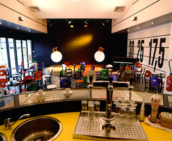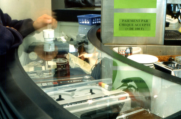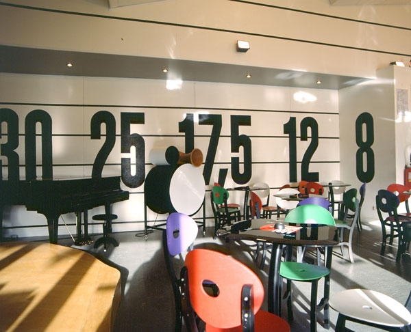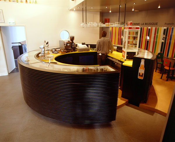 The entire cafe (tables, chairs, bar, sound furniture, acoustic speakers) was conceived by Patrice Carré. Each part of the ensemble refers to objects used for sound diffusion. The graphic writing in the space is black and white, recalling a partition. The profiling of the bar is constituted by a pile of black arcs, in reference to vinyl records. The counter contains vitrines where singular objects for producing sound are displayed. On the wall behind the bar, 60 elements in transparent glass and mirrors compose a row of cds of which one can see the side.