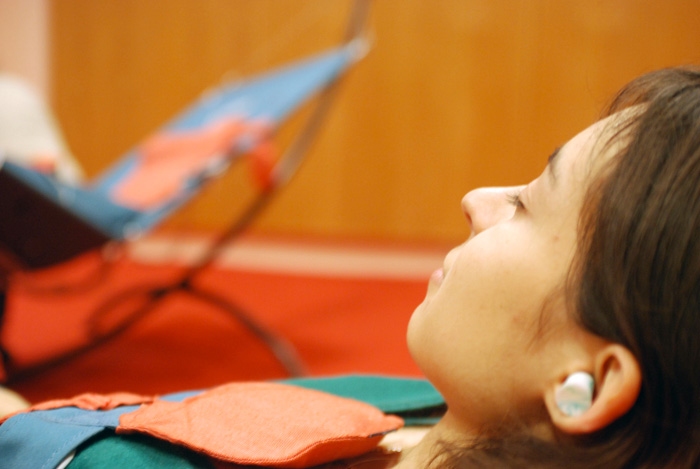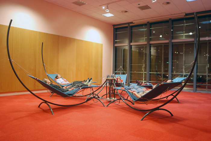 Équipés d’un réseau de 70 haut-parleurs sans membranes, cinq hamacs font circuler des sons sur le corps des auditeurs. Les vibrations rendues perceptibles sur le corps sont transmises à l’oreille par conduction osseuse. Muni de bouchon d’oreilles, l’auditeur perçoit de fines vibrations localisées qui se déplacent sur sa peau en même temps qu’il les entend comme venant de la surface ou de l’intérieur du corps. |