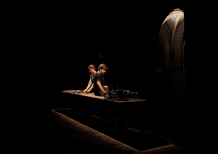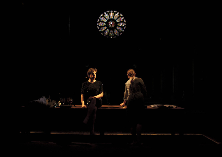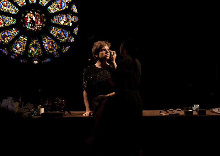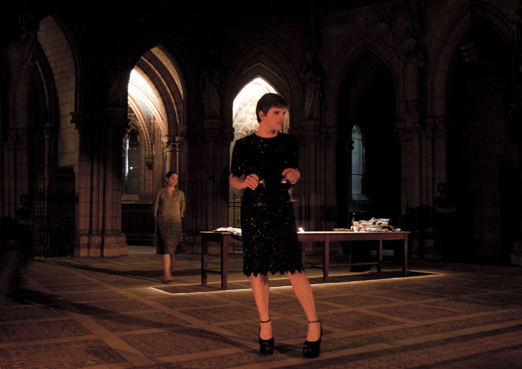 Le public entre dans le domaine d’une icône au genre indéterminé. Il pénètre dans une église vide, territoire d’une figure mythique. La vie de ce personnage principal est en suspens dans cet espace qui traverse le temps. La présence nouvelle des spectateurs crée une onde dans cet univers comme un galet jeté dans l’eau. Le regard venu de l’extérieur est une perturbation qui incite à la mise en mouvement. À partir d’un état d’être diaphane, on assistera à une tentative d’incarnation. L’icône passera peut-être du statut d’image à celui d’être de chair aux yeux du monde. Le rituel sera nécessairement réinventé pour sortir du mythe. Pour mettre en relief l’inexorabilité de ce type de processus de naissance et de mort, la performance se joue en boucle.