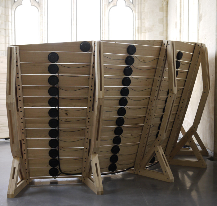 Structure châtaignier, silentbloc, vibreurs, diffusion sonore : spatialisation 21 canaux