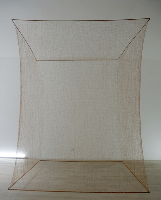 Fil de cuivre tricoté monté sur cadre de cuivre, 2 x 2 x 2,4 m