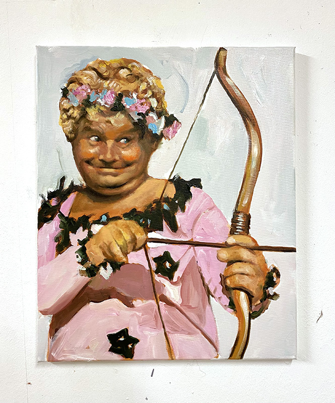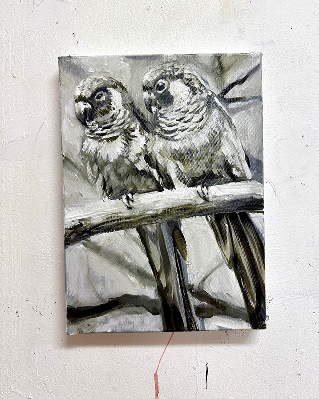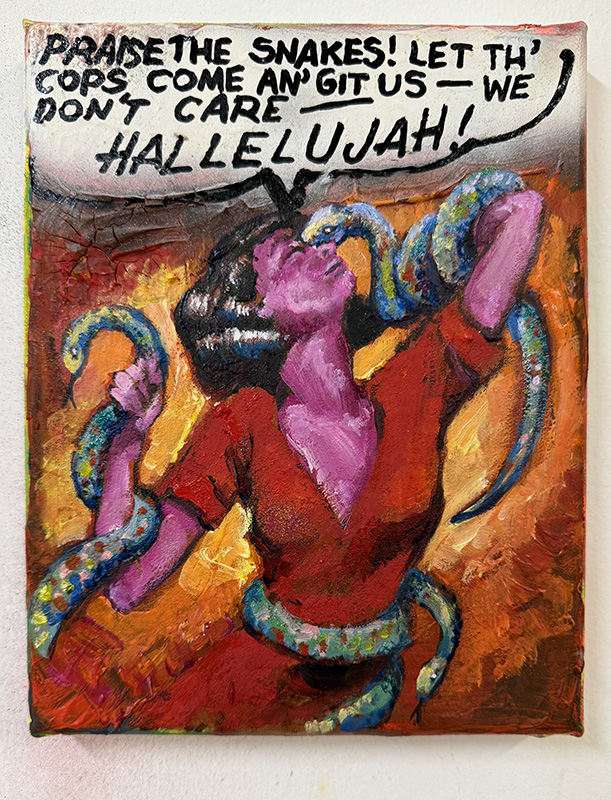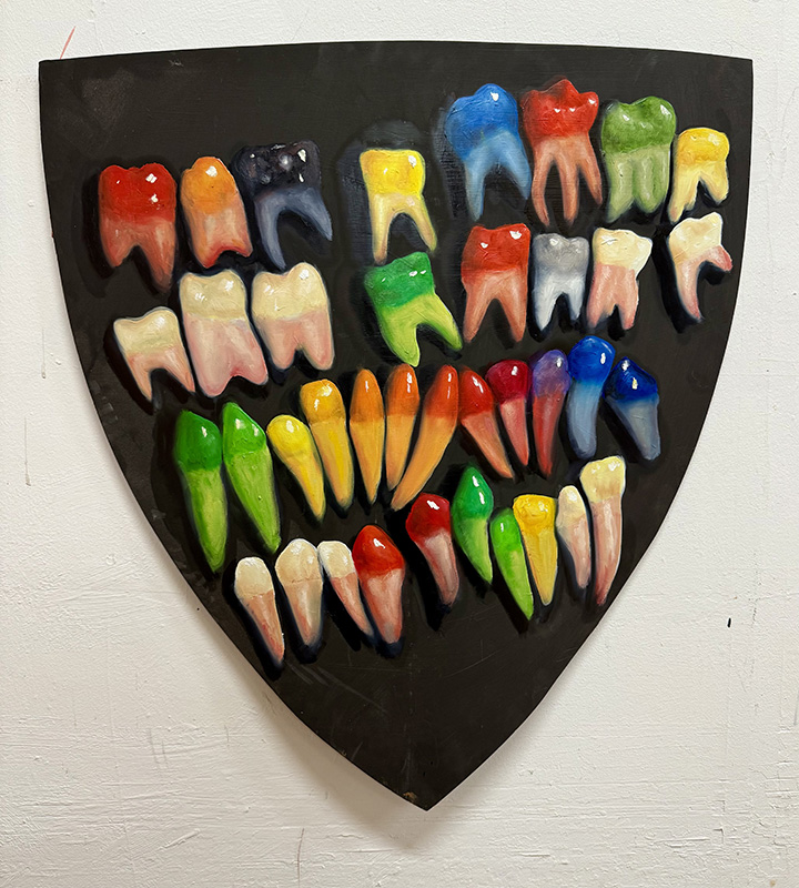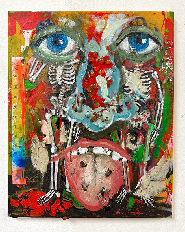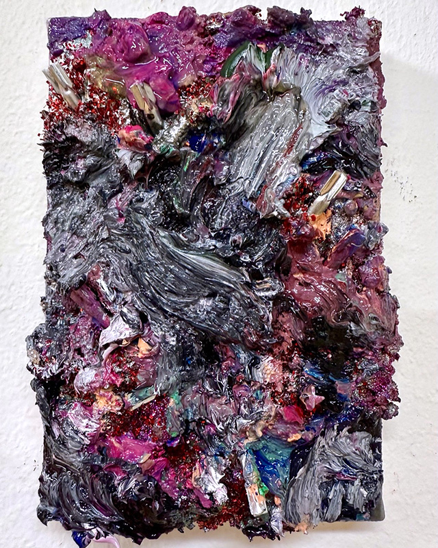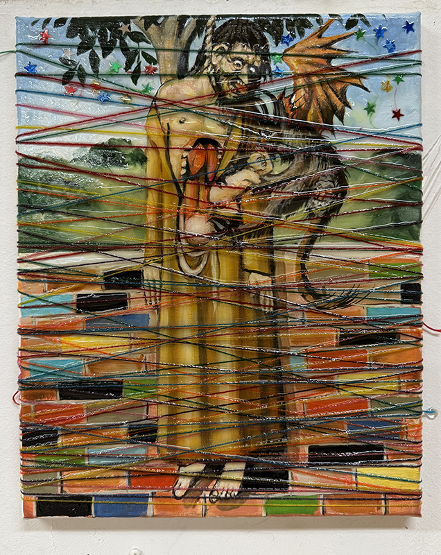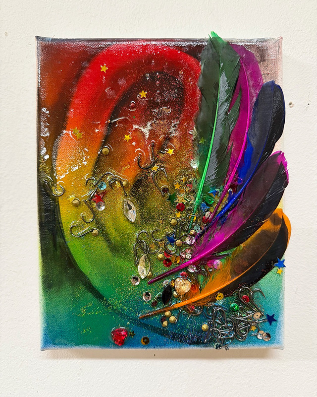 Huile, résine, hameçons, plumes, strass sur toile, 24x19cm |