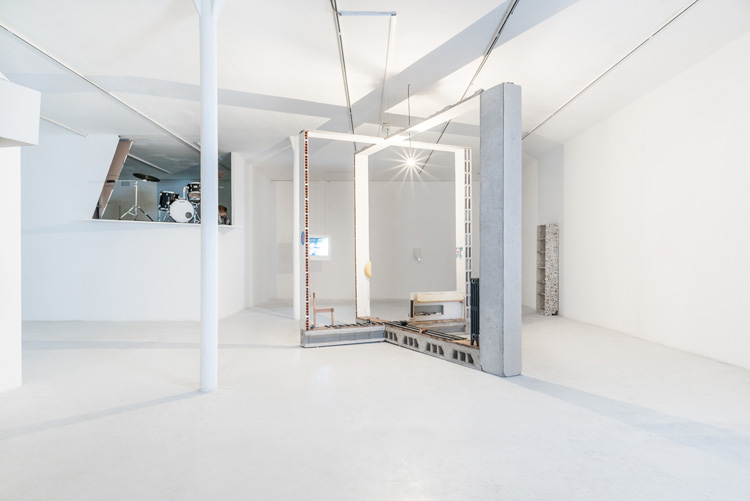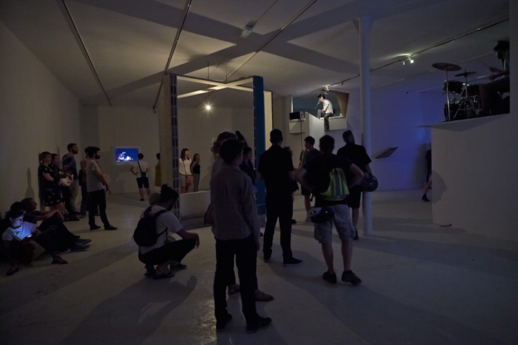 Autour de la chambre, gravitent des objets hétéroclites qui semblent sortir d’un rêve et entretiennent une atmosphère étrange. Certains ont été expulsés, ils ont dérivé dans l’espace, comme le lit ou le tapis qui servent de support au duo de musiciens Postcoitum que l’artiste a invité pour une performance lors du vernissage et avec qui il partage un univers commun.