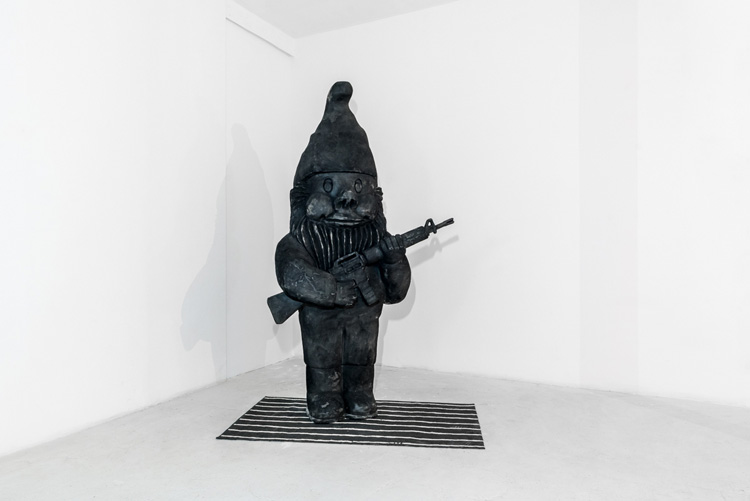 La fiction commence au centre de l’expo, où le visiteur découvre l’écorché d’une chambre d’enfant, celle du fils de l’artiste reproduite à l’identique, à l’échelle 1. Les billes, les jouets, les vêtements le tapis, le lit ont été découpés selon l’implacable orthogonalité des deux lignes qui déterminent cette sculpture. Tout aura été scindé sur leur passage, comme si les lois de l’architecture faisaient fi de ceux qui vivent dans ces espaces que Gordon Matta Clark définissait comme « un espace clos, préconditionné non seulement par nécessité physique mais aussi par l’industrie qui inonde les villes et les banlieues de boîtes habitacles dans le but inavoué de s’assurer le concours d’un consommateur passif et isolé. » Trancher dans le vif pour donner à voir le ventre du bâtiment convoque dans l’esprit du visiteur les déconstructions de Gordon Matta Clark et sa critique sociale et acerbe de l’architecte et de l’architecture (« Il procède dès l’origine à un découpage et à une transformation des immeubles, en tranchant littéralement dans les murs, les cloisons ou les sols », commente Olivier Lussac), mais également les pièces englouties de Grout & Mazéas, plus légères dans leur propos, qui ont d’avantage à voir avec les décors de cinéma et donc avec l’envers du décor… Entre réalité et fiction, les éléments qui s’organisent autour de la Chambre semblent tout droit sortis des rêves ou des cauchemars de l’artiste ou de son fils. Un nain géant armé qui monte la garde (Priape), une étagère Ikea criblée de trous de perceuses (Kill Billy), des animaux naturalisés errants dans l’espace… La réalité explose littéralement ; au visiteur d’en recoller les morceaux disséminés dans l’exposition. Ledit visiteur explore son nouvel environnement à l’instar des personnages interprétés par Gilles Desplanques lui-même, dans les vidéos qui sont comme des fenêtres ouvertes sur l’inconscient de l’occupant de la Chambre. L’Île de béton qui fait référence au roman éponyme de Ballard, montre un personnage qui s’approprie un monde dans lequel il semble demeurer le seul humain encore vivant, jouant avec le paysage (scène de golf improvisée sur le Han gelé) et les différents éléments trouvés sur place. Le sentiment qui se dégage des films oscille entre désespoir de fin de monde et absurdité comique où tout n’est plus qu’un jeu. Chaque personnage tente de faire avec son environnement, de jouer avec le contexte et de survivre avec ce qu’il trouve. Protocole que s’impose Gilles Desplanques pendant ses performances, une fois le lieu repéré pour des qualités qui permettent à l’artiste de « sculpter la matière du paysage ». Desplanques tourne en totale improvisation et avec une économie de moyens. Comme un Robinson Crusoé d’aujourd’hui, mais surtout comme une figure métaphorique de l’artiste qui se débrouille avec les moyens qu’on lui donne. Sa trilogie de l’errance met donc en scène des personnages auxquels la solitude confère un statut marginal. À la limite de la folie, happée par l’urbanisme qui les prive pourtant de toute urbanité, en proie à un environnement qui phagocyte l’humain. On suivra ainsi les parcours d’un surveillant lui-même surveillé par un drone, d’un homme en combinaison orange se fondant dans le paysage, et celui d’un homme en slip orange et en claquettes dans un univers de glace et de neige — une vidéo réalisée lors de sa résidence à Séoul lors des échanges France-Corée… Ces espaces existent pourtant tels que Gilles Desplanques nous les montre, et s’ils nous inspirent un monde inhospitalier, ravagé par les désastres écologiques, c’est peut-être que nous n’en sommes plus très loin. Il ne s’agit pas de construire une œuvre d’anticipation, mais bien de jouer avec les transformations opérées par l’homme : la bauxite des boues rouges de Gardanne, une ruine architecturale vestige de la consommation culturelle, la propagation du béton qui chasse toute aire de nature d’une ville comme Séoul… L’œuvre interroge le réel.