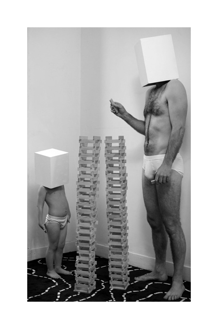 À l’entrée de l’exposition, un spot éclaire une image qui nous éclaire sur le propos sous-jacent de l’exposition. Deux personnages, un enfant et un adulte, se tiennent devant une tour de Kapla. L’image livre des intentions de filiation et de transmission, celles d’un père à son fils, des générations passées aux générations futures, celles de notre propre passage de l’enfance à l’âge adulte et des gestes de l’artiste, qui ne sont que le prolongement des gestes de l’enfance…