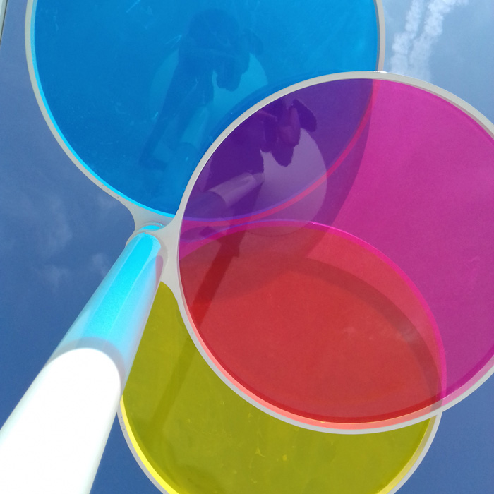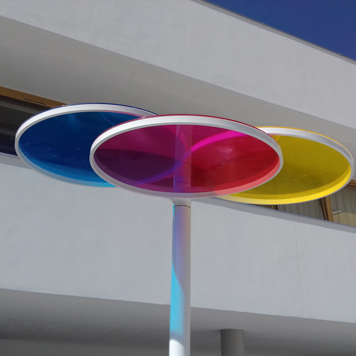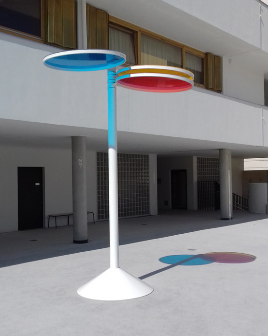 Les 3 panneaux de couleurs primaires qui composent cette horloge chromatique sont translucides. Ils agissent comme des filtres. Ils se superposent et changent de couleur chaque seconde qui passe. Le soleil projette cette palette au sol, variant lui-même au fil de la journée.