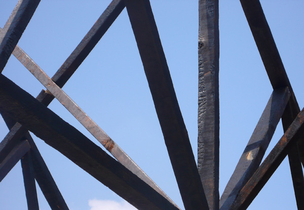 Une charpente brûlée sur le modèle des maisons standards PHENIX sort des décombres du hangar en ruine. Cette ossature fragile dessine une maison entre deux états, une ruine construite qui émerge d’une autre.