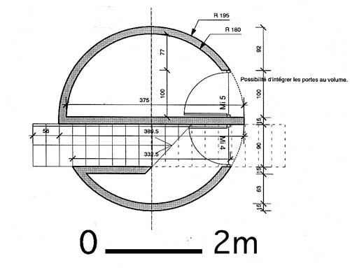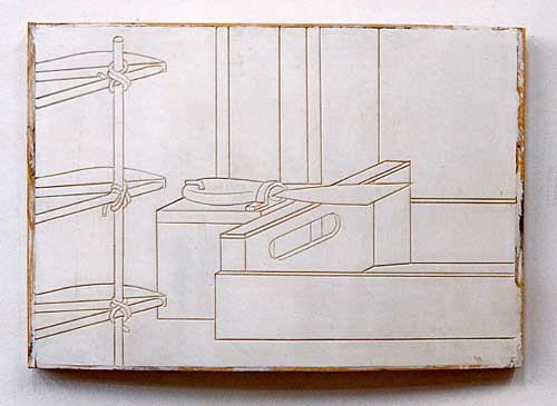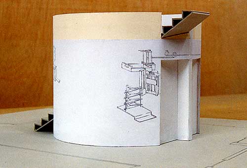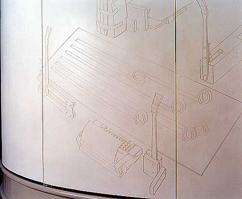 Pour distinguer ce cylindre comme élément sculptural particulier dans l’architecture, je l’ai fait revêtir de panneaux de staff. Ensuite j’ai gravé directement dans la surface des dessins de la série Ville. De façon ludique des objets quotidiens y apparaissent et créent un paysage urbain imaginaire. La surface courbe du cylindre ainsi que le fait qu’on a très peu de distance face à lui font qu’on a de chaque point de vue qu’une perception fragmentaire de l’ensemble. C’est en circulant autour qu’on comprend au fur et à mesure la continuité de ce paysage - y compris les “vides”, les distances - et la complexité de la forme architecturale. A travers le mouvement se fait un rapport entre l’espace réel et un espace mental.