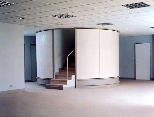 Dans le hall de circulation au rez-de-chaussée de la Trésorerie Principale s’inscrit un cylindre de 3,90 m de diamètre et de 2,60 m de hauteur qui héberge deux petits espaces et un escalier de liaison avec le premier étage du bâtiment. Les espaces environnants sont des lieux administratifs, le cylindre est un élément de repère qui articule les mouvements à l’intérieur de l’institution.