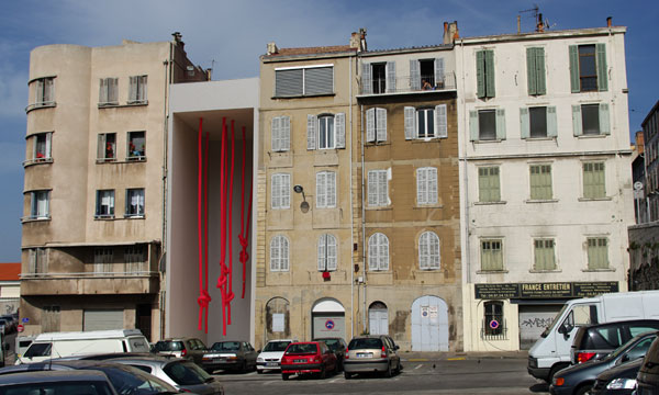 On peut imaginer la tour à cordes à noeud intégrée dans une rue, reprenant la dimension d'étroits immeubles marseillais, ou accollé à un bâtiment contemporain.