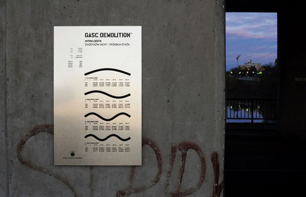 Panneau urbain accroché sur un pilier du 1er étage du Double Pont de la Voie Rapide traversant la rivière Drava de Maribor, cette plaque d’aluminium gravée présente le tableau de calculs effectués par un physicien slovène à la demande d’Anne-Valérie Gasc. Cette table indique le panel des fréquences susceptibles de faire entrer en résonance une partie du pont et, à terme, de le détruire.