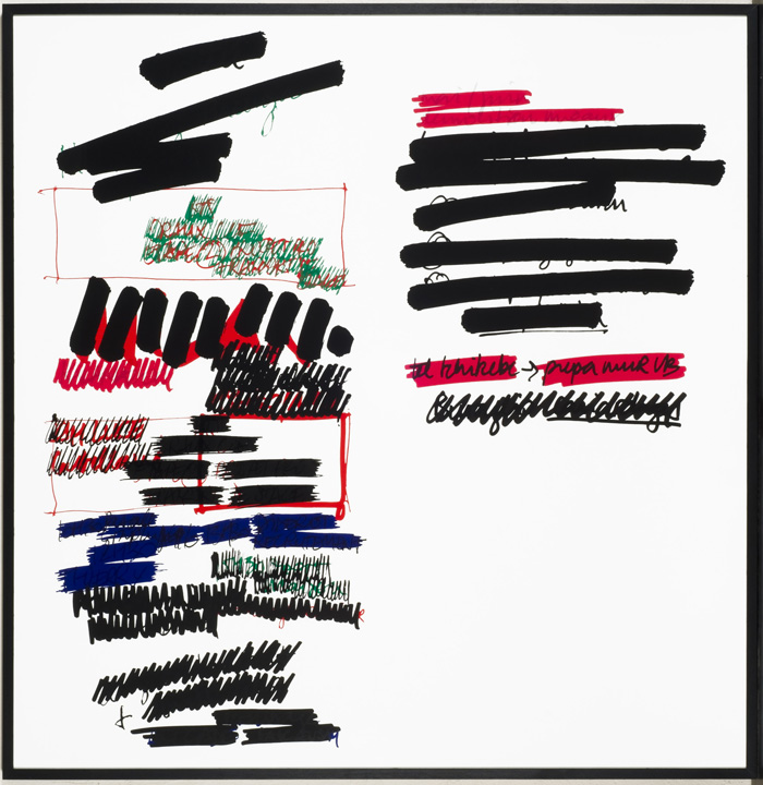 d’Anne-Valérie Gasc, est poussé à son faîte puisque chaque information, chaque tâche à accomplir, chaque rendez-vous pris est rayé une fois l’étape franchie, comme on coche une case sur un plan de route au fur et à mesure du parcours. Plus que rayé, il est vigoureusement raturé jusqu’à disparition complète, c’est-à-dire qu’il est supprimé par recouvrement, comme on repeint un mur. L’évènement, une fois survenu, est effacé. Le futur, en passant au passé, est oblitéré par un présent comme curseur de démolition. Le temps s’écoule, le temps s’écroule.