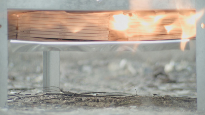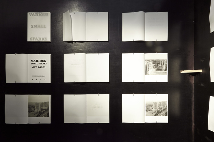 Feu-Principe de contradiction, documenté par deux vidéos, est une action destinée à conformer l’édition Various small sparks au protocole édicté par Ed. Rusha : un tirage à 400 exemplaires. Tenue contractuellement d’éditer 500 livres, Anne-Valérie Gasc procède, le 25 janvier 2015, à la combustion des 100 exemplaires surnuméraires.