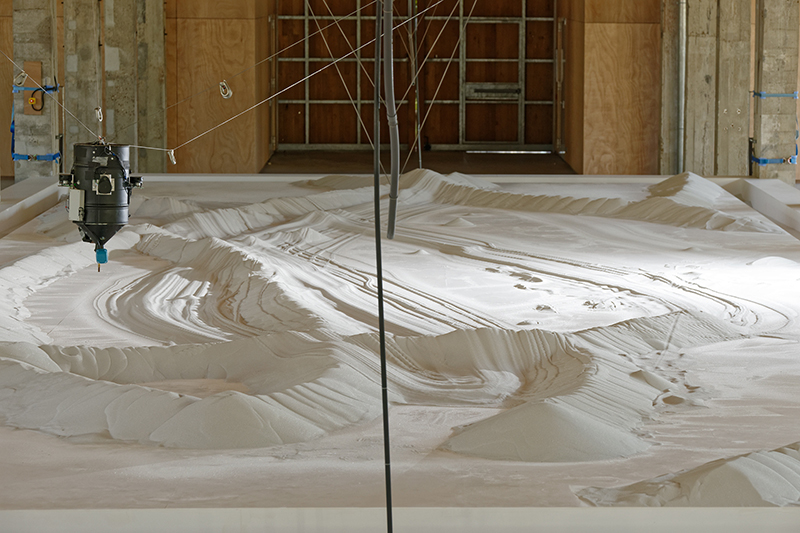 Œuvre robotisée réalisée en résidence par l'artiste Anne-Valérie Gasc, accompagnée par la commissaire d'exposition Emmanuelle Chiappone-Piriou.