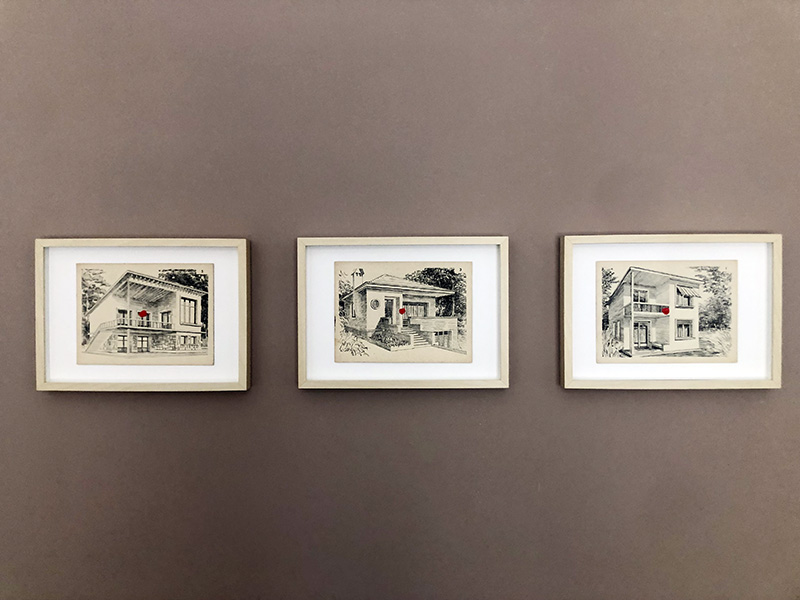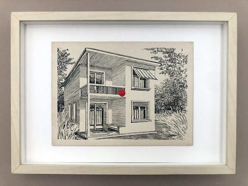 Série de 20 planches imprimées extraites de l’édition Petites maisons pour l’après-guerre _ 40 planches (A. Dulong, Paris, Ch. Massin, 1946) touchées de peinture acrylique rouge de cadmium, 21 x 15,5 cm |