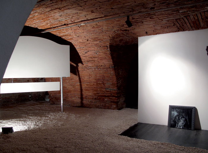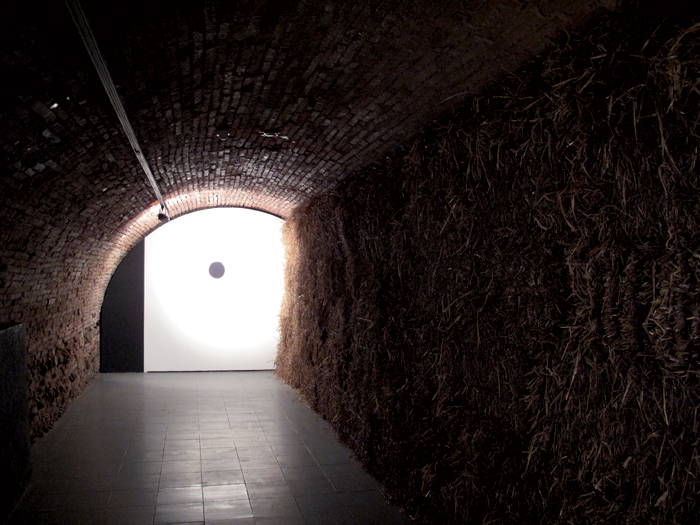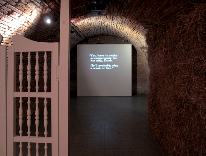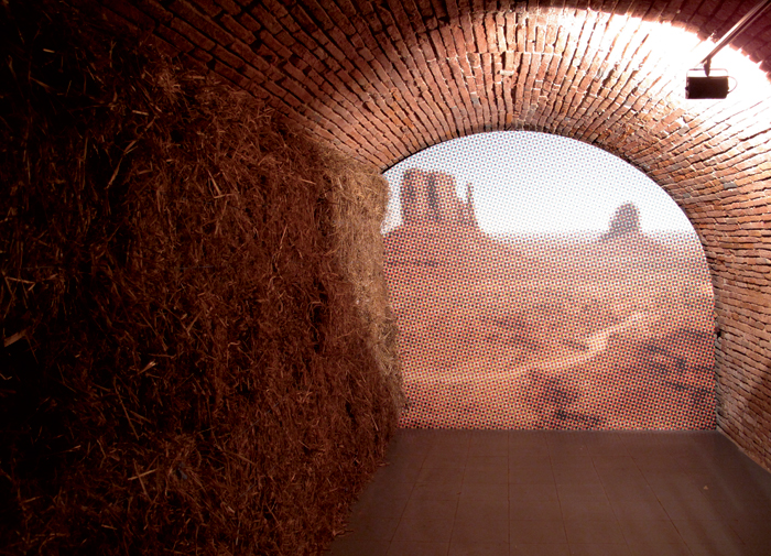 Impression numérique sur papier intissé, porte va-et-vient en bois et métal, bottes de paille vidéo projection en boucle (durée 53’)