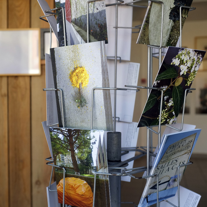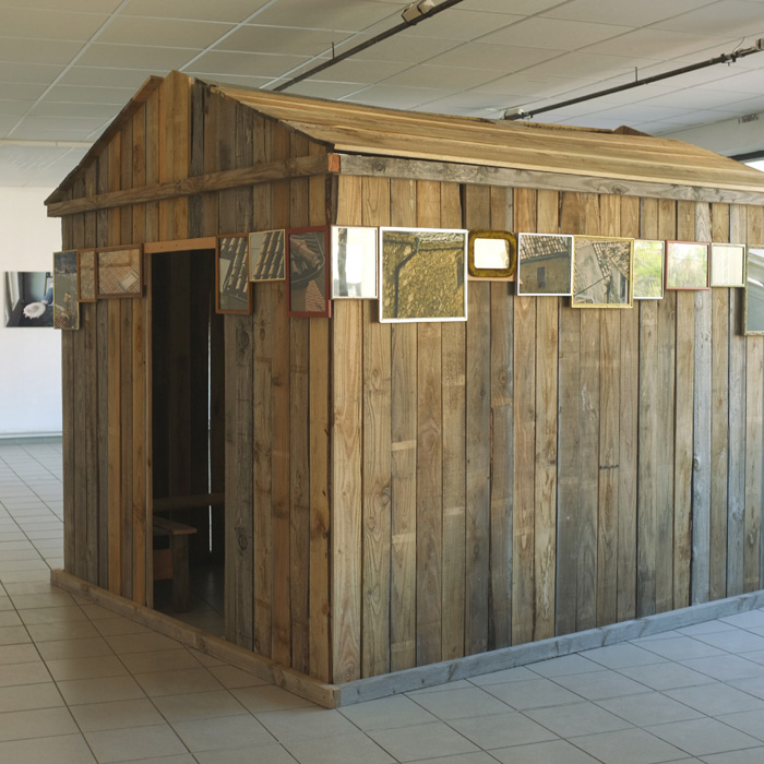 J’ai installé une hutte en bois au milieu de la salle d’exposition du lycée Antonin Artaud. Aucune image ne se trouve à l’intérieur de la hutte, seulement des bancs. Je les ai conçus en pensant aux pauses des élèves. Porte, fenêtre et toit ouvrent sur des photographies de l’exposition où une série d’images de paysages et d’objets évoquant la campagne invite à une balade : une sorte de passerelle entre un lieu d’étude et le “grand air“. |