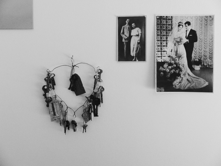 Au mur sont associés des objets et des images liés aux souvenirs personnels, mais aussi des images et des choses trouvées et gardées pour la beauté de leur forme ou l’étrangeté de leur aspect. L’étrange et le familier sont réunis dans un même mouvement de lecture.
