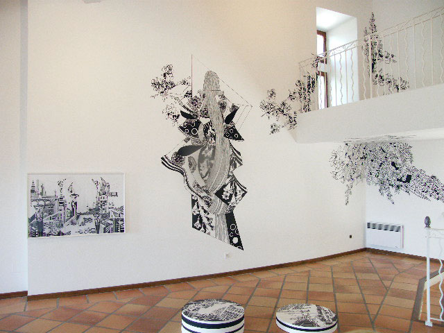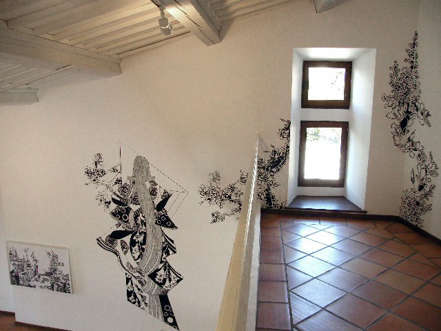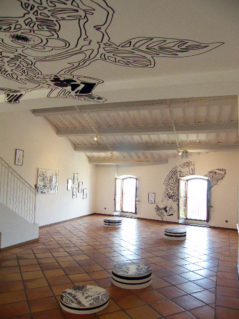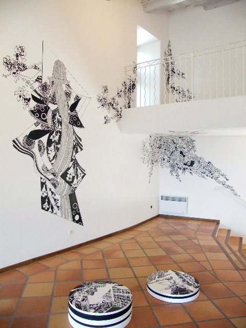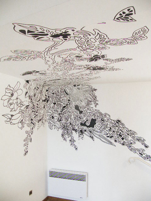 (…) Chourouk Hriech a répondu à l’invitation du FRAC et de la commune de Lurs en travaillant sur un projet spécifique pour la Chapelle des Pénitents. Adepte du dessin et du noir et blanc, elle s’est inspirée du paysage, de la nature et de la végétation en plein éveil pour réaliser lors d’un court séjour à Lurs plusieurs dessins muraux.