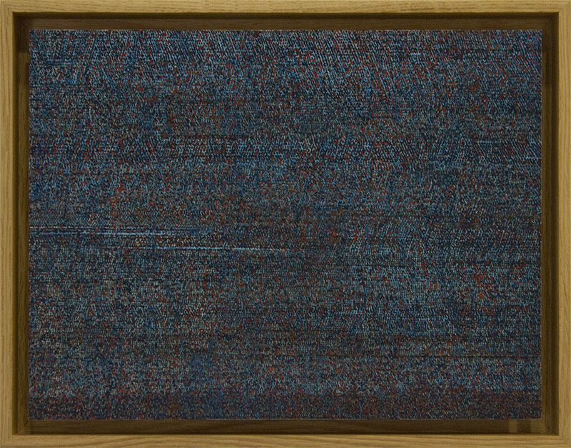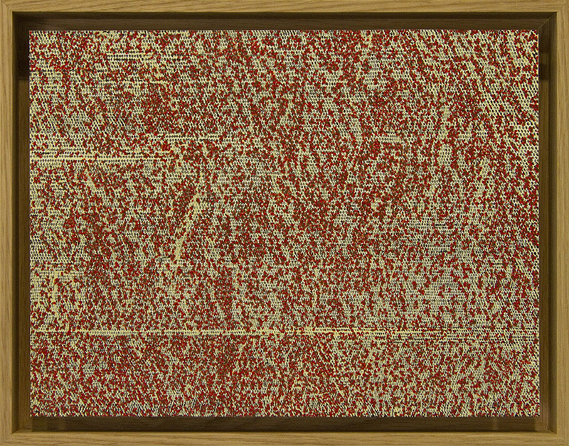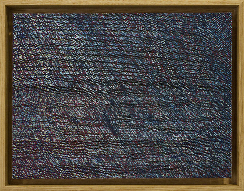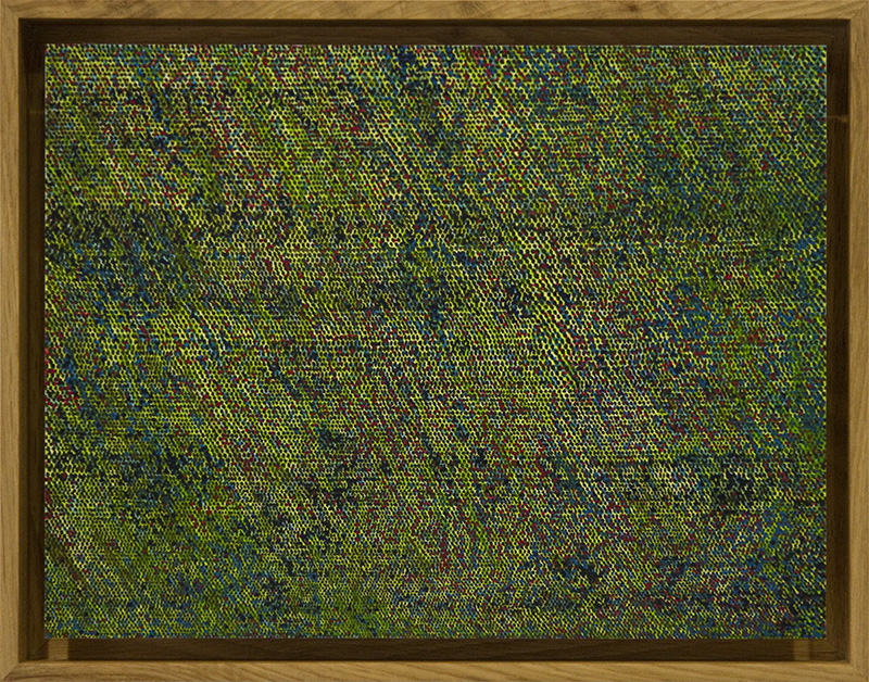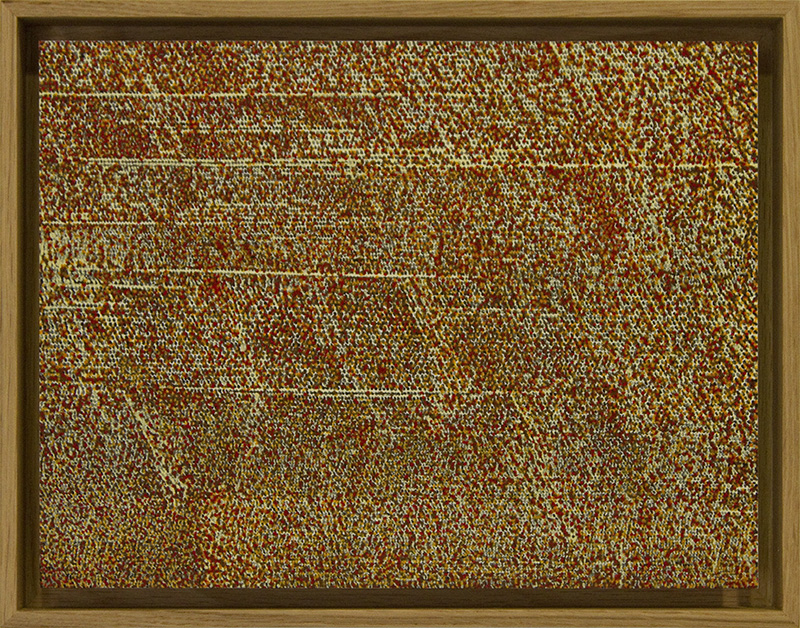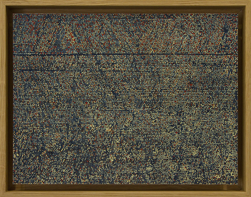 Ensuite, l’application d’une couleur dans les diagonales pour dessiner un mouvement global. Puis, des successions de points colorés dans les interstices et ce qui semble devenir des interstices.