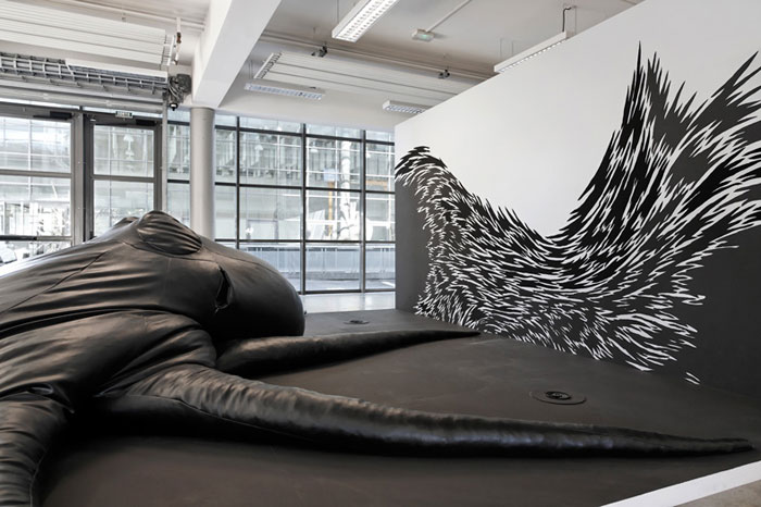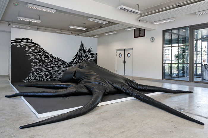 Le décor dans lequel évolue la sculpture rappelle les décors éphémères des plateaux de cinéma. La peinture murale joue avec la notion de trompe-l’œil et évoque une hybridation énigmatique entre une fourrure et une vague qui semble avoir été sécrétée par la pieuvre elle-même, comme si elle tentait ainsi un camouflage désespéré.