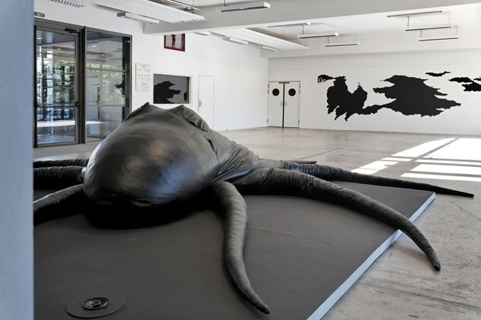 L’installation est composée de plusieurs éléments : une sculpture, des peintures murales, une composition musicale originale de Julien Hô Kim. Une pieuvre en skaï noir est placée au centre d’une saynète dont elle est à la fois l’actrice et la spectatrice. La rencontre de ces différents éléments n’offre aucune lecture univoque, mais propose au spectateur différentes pistes de réflexion et d’interprétation.