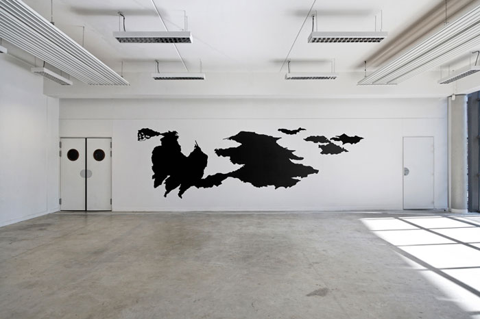En vis-à-vis, une autre peinture offre le même brouillage des signes, on peut y voir aussi bien un ciel de nuages qu’une cartographie. Seul élément parfaitement identifiable de l’ensemble, un crâne se dessine à l’extrémité de l’ensemble, faisant ainsi écho explicite au titre de la pièce.