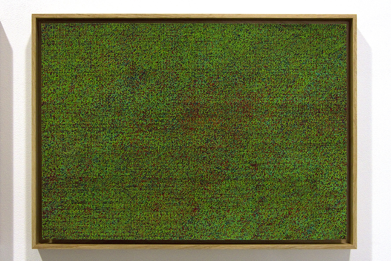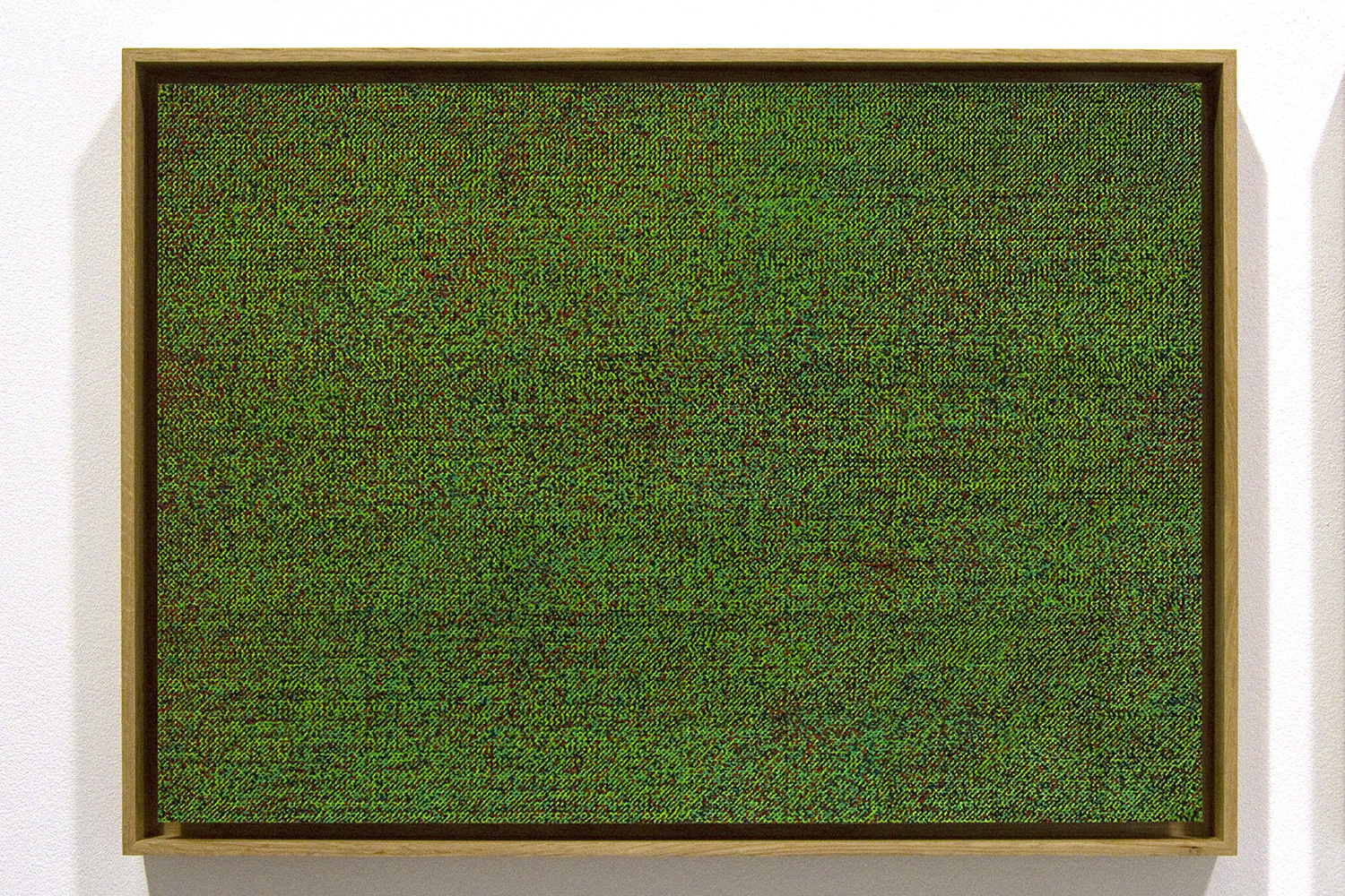 Écrans fait explicitement référence à l’objet qui rend l’image visible. Mais elle n’apparaît toujours pas. Les couleurs créent une vibration, voire une luminescence ; la texture absorbe le regard et son grésillement devient hypnotique. Deux variations, comme deux captures d’écran prises dans un temps resserré avec un encadrement leur conférant une dimension objectale.