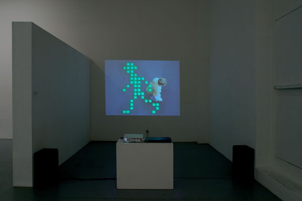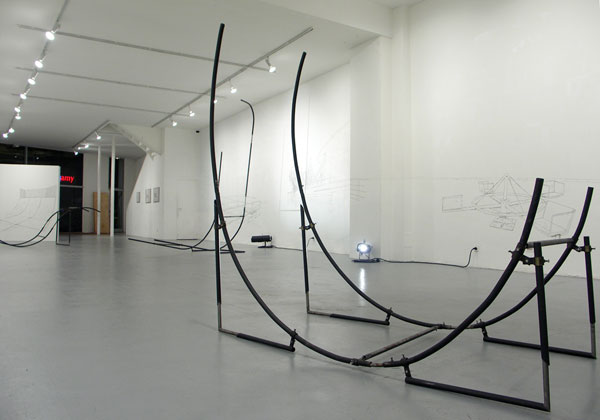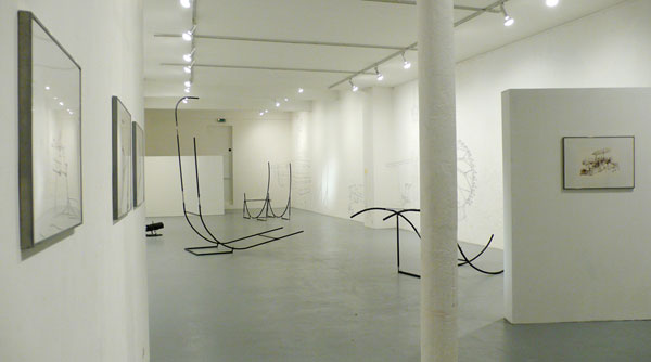 Vues de l'exposition Amorces, Carré Bonnat, Bayonne Dessins muraux (fusain), dessins sur papier, vidéo, projecteurs à découpe, structures tubulaires métalliques modulables