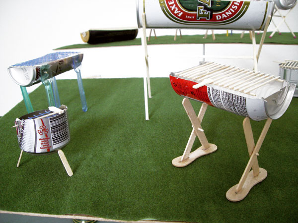 Canettes en métal, cure-dents, pique-brochettes, allumettes, grillage, bâtons de glace et mélangeurs trouvés dans la rue, flocage sur médium, shiloms, tiges aluminium, 120 x 450 x 160 cm