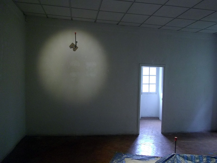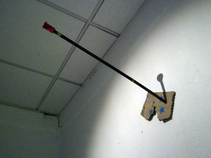 Arrêter le temps c’est ce que propose viser la lune. Une barre de chantier traverse et plante un morceau de carton, le cloue au mur comme on cloue une œuvre, un tableau. Imprimé d’étoiles bleues, le reliquat d’emballage évoque, par le biais d’un éclairage circulaire, le spectacle sous les projecteurs, la voie lactée. Le titre, en référence à cette citation d’oscar Wilde : « Il faut toujours viser la lune, car même en cas d’échec, on atterrit dans les étoiles », nous donne le ton.