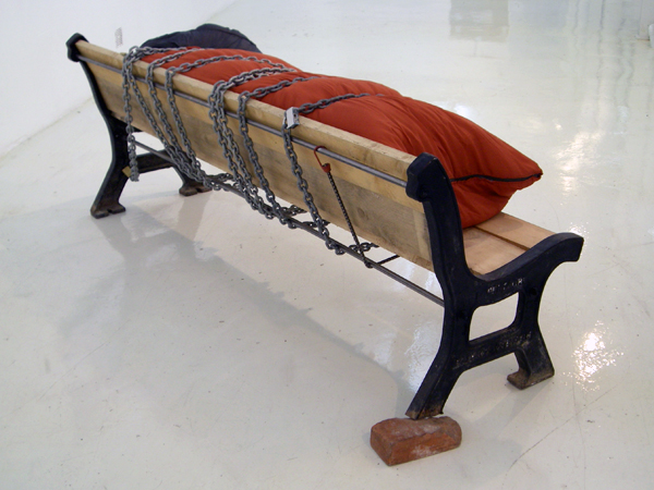 Ici, un banc public devient propriété privée d’un sans domicile. Il est constitué de matériaux de construction : bois de coffrage, brique, barres métalliques, y est enchainé un nécessaire de couchage (sac, couvertures, matelas) soit un kit de protection climatique.