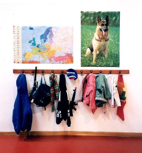 Porte-manteau à patères, vêtements, armes en plastique, posters, 154 x 220 x 9 cm